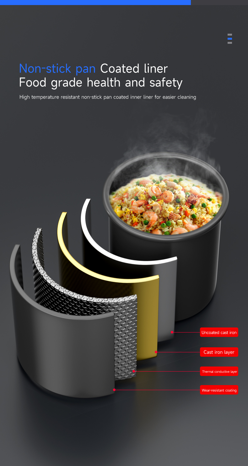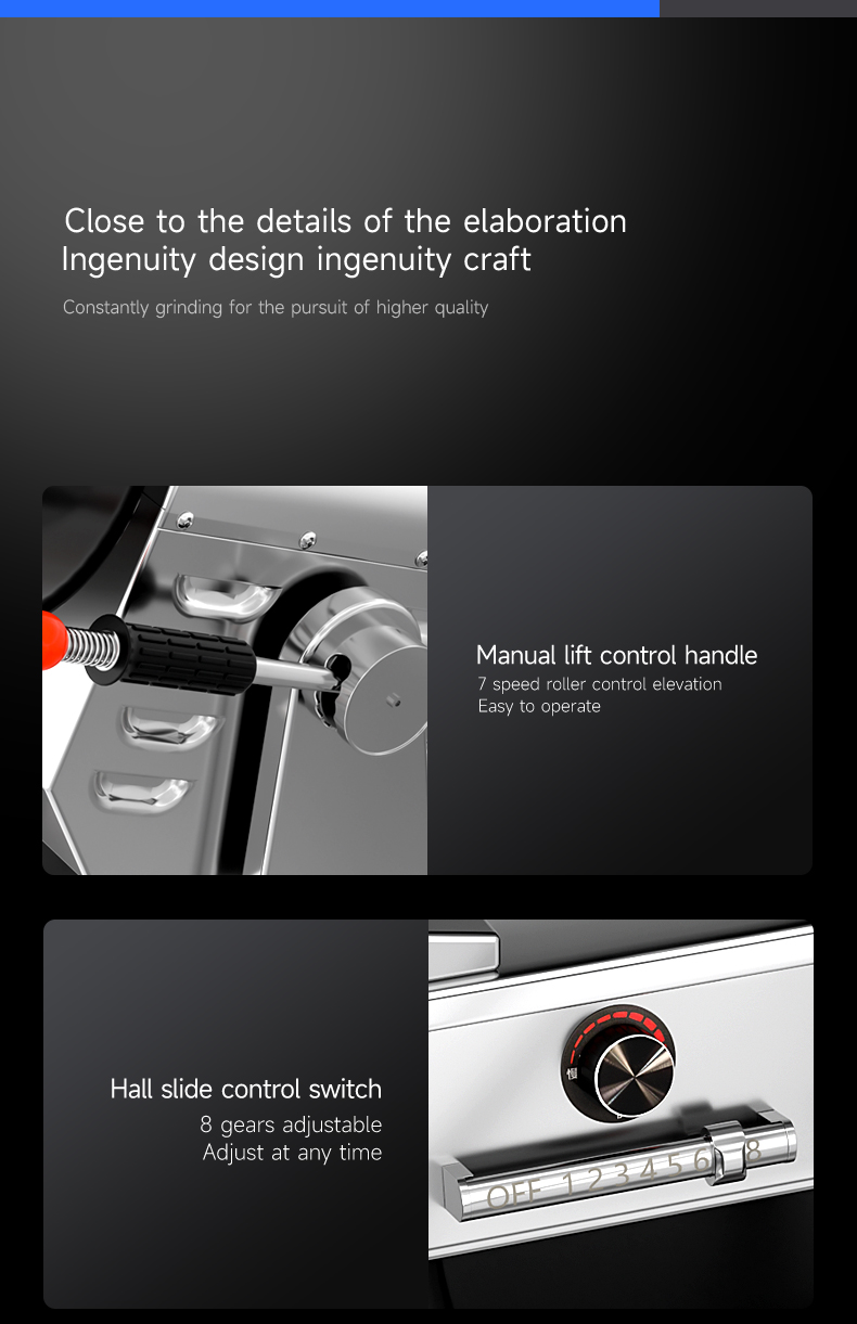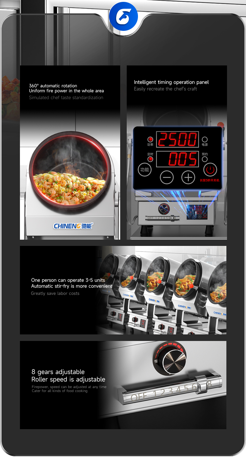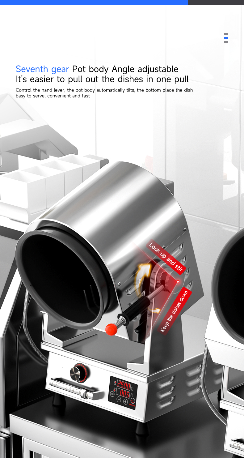 Electric control tilting + emergency stop function + infrared testing + storage for 800 recipes (intelligent learning function) + real-time voice broadcast + three automatic seasoning ports